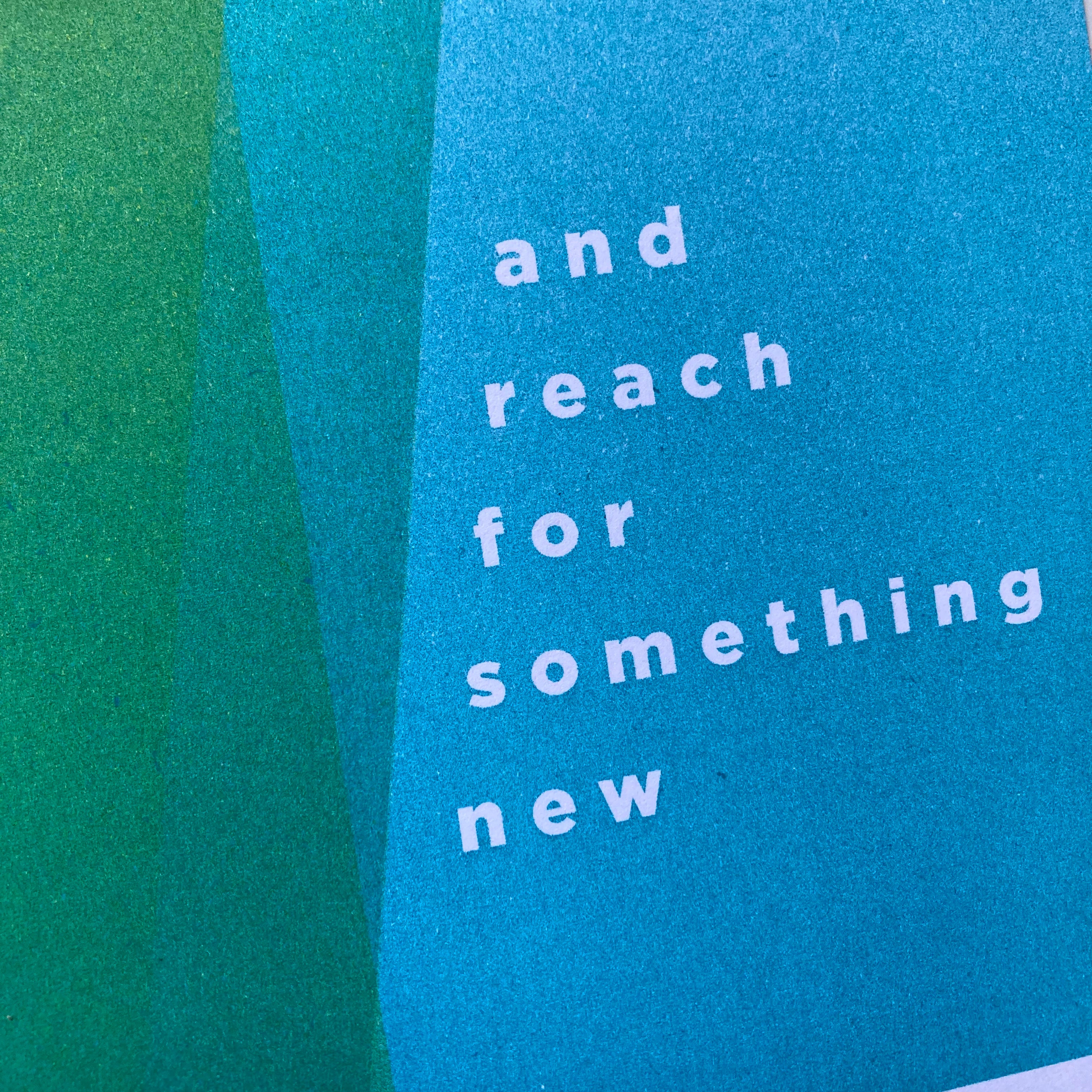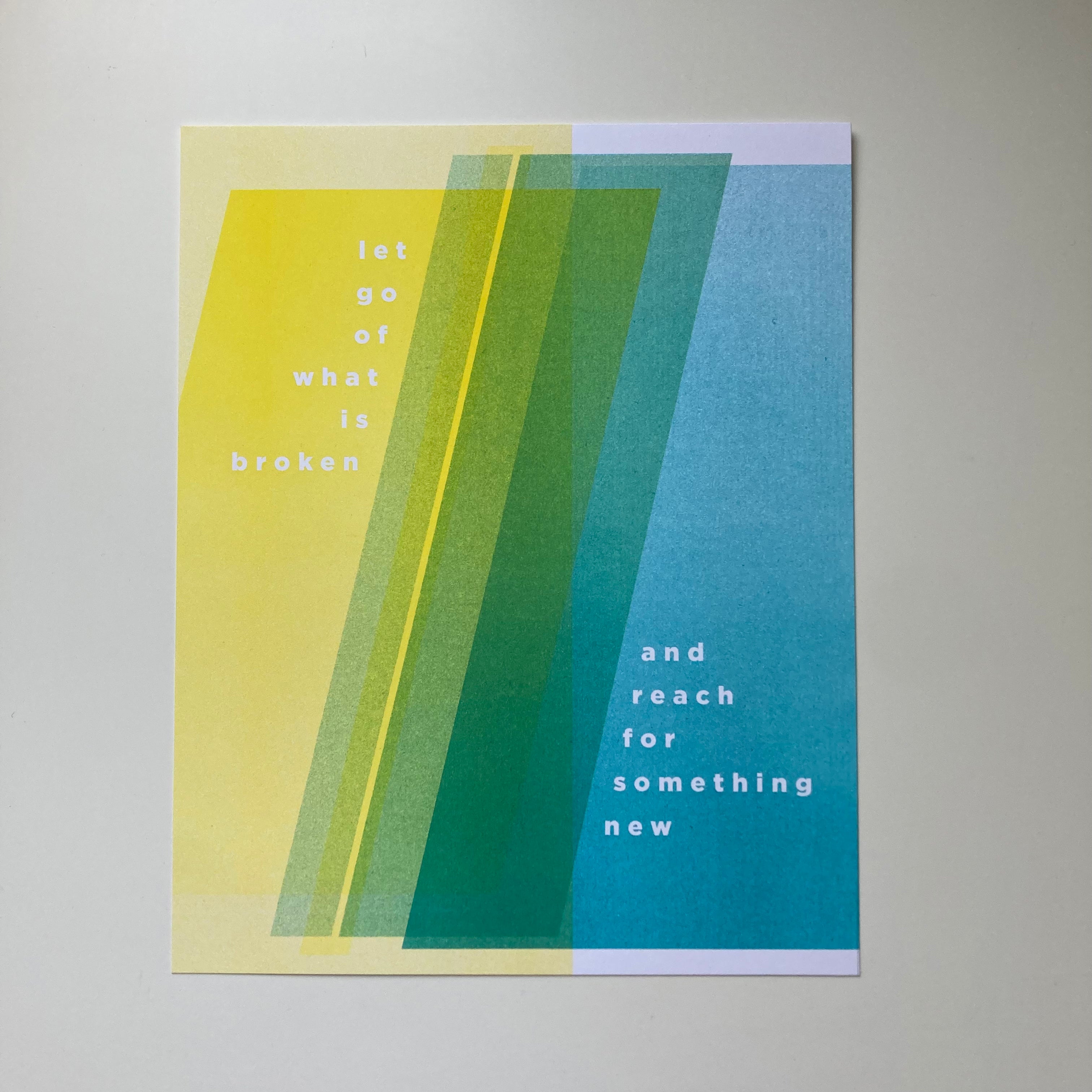 Print reads: "let go of what is broken, and reach for something new" on a field of bright yellow and blue.