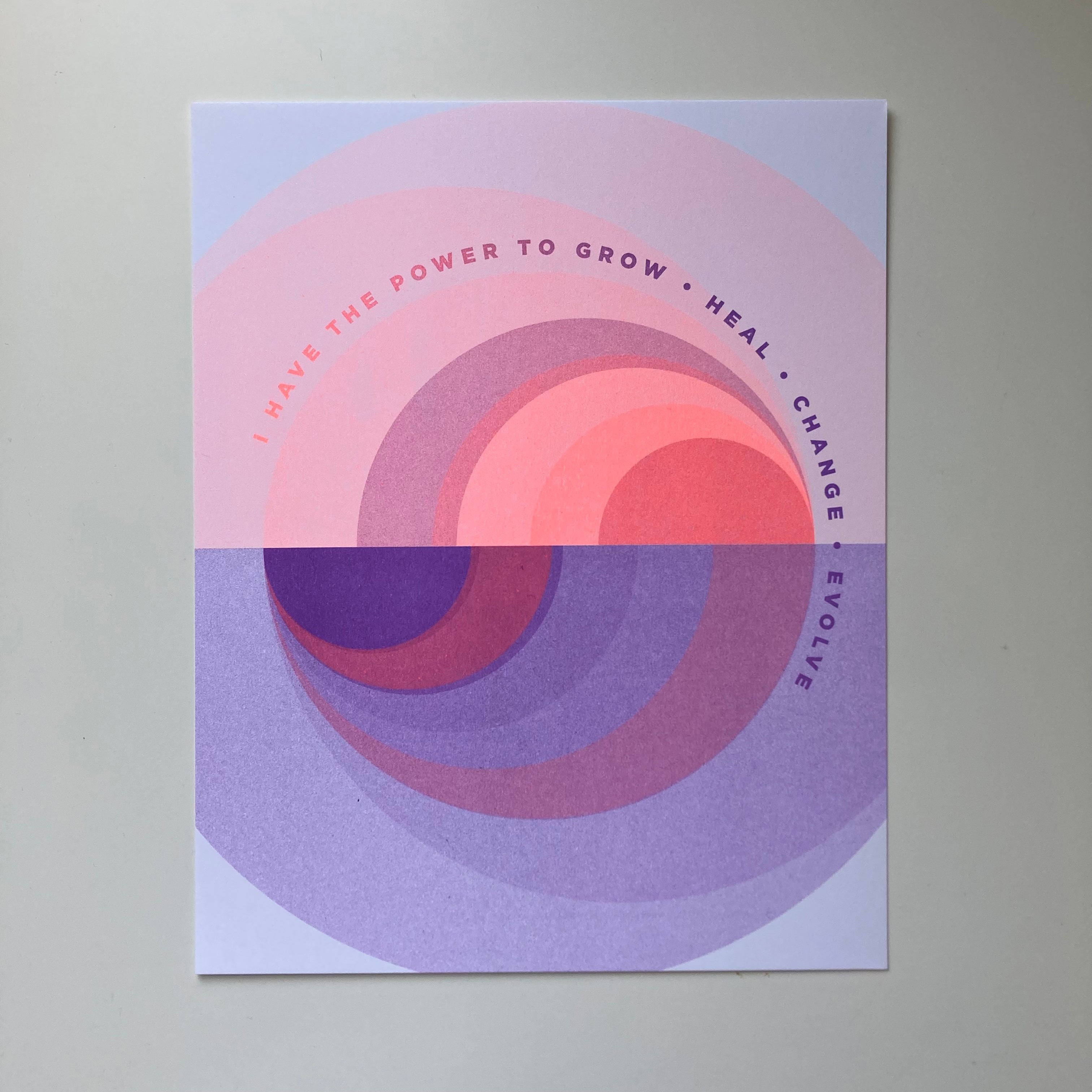 Print reads: "I have the power to grow, heal, change, evolve" risograph printed in neon orange and purple Ink.