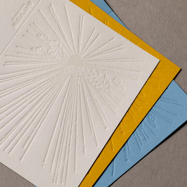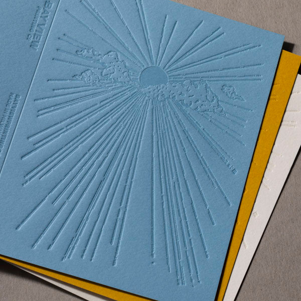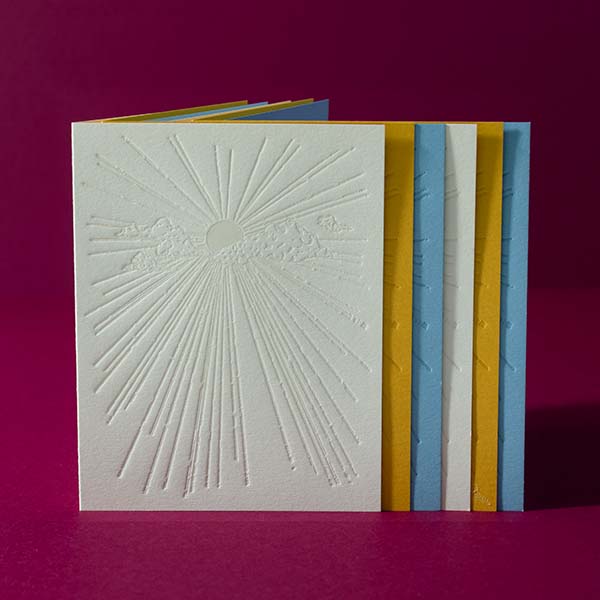 Let those glorious sun rays warm your soul! Cards feature a blind debossed illustration of the sun breaking through the clouds. Letterpress printed on Indian Yellow, China White and Azure Blue papers, paired with soft white envelopes. Blank inside and perfect for any occasion.