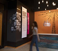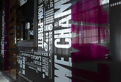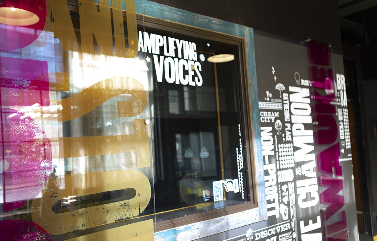 Layers of brightly printed plexiglass contrast bold illustrations, helping illustrate the multi-faceted goals that 88Nine aims to brings to the community.
