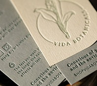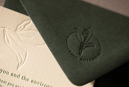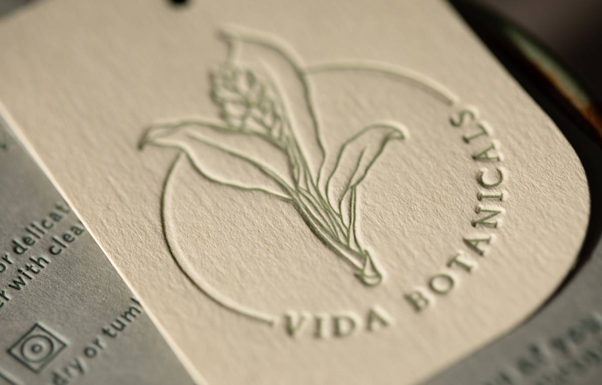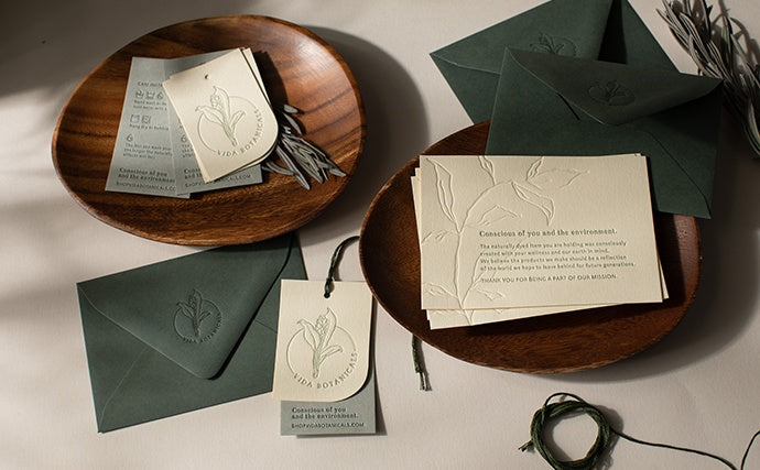Product hang-tags and business cards feature a soft, hand-drawn turmeric plant printed on a richly textured cotton paper, while the thank you cards tell the Vida Botanicals story.