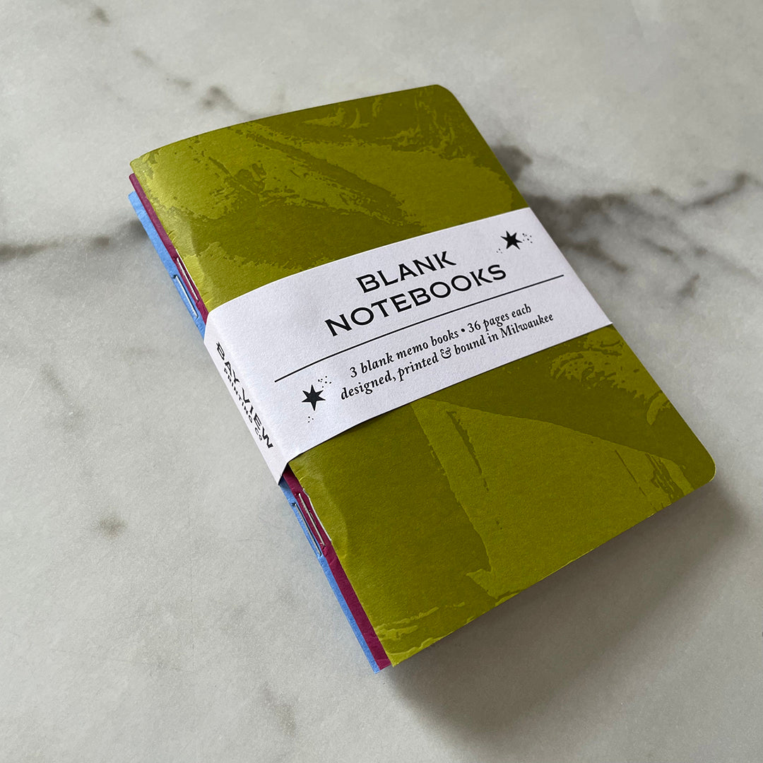 Heavyweight letterpress cover with tonal ink-swipe print, 32 blank pages of white sketch paper, gold foil Bay View Printing Co logo on back.