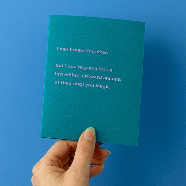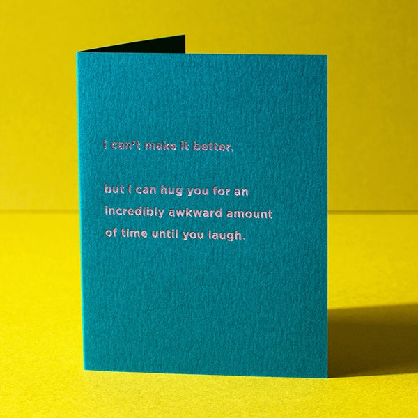 When a real-live hug isn't possible, snag this card, add a wholesome handwritten message (preferably in old-timey cursive), and snail-mail it out to someone who needs some warm vibes. The message reads: "I can't make it better. But I can hug you for an incredibly awkward amount of time until you laugh."