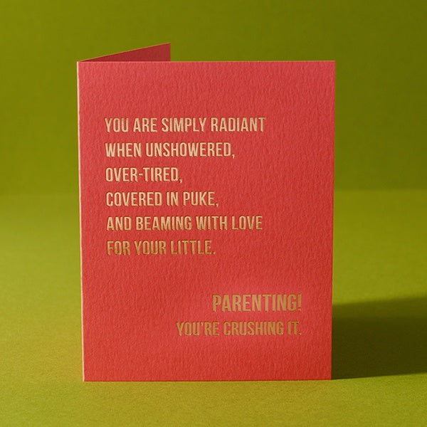 Know a parent in need of a morale boost? Remind them how positively stunning they are at all times with this card. The full text reads: "You are simply radiant when unshowered, over-tired, covered in puke and beaming with love for your little. Parenting! You're crushing it."