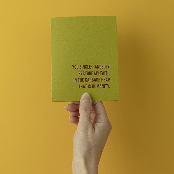Let someone know they are the best and brightest thing in your life with this greeting card that reads: "You single-handedly restore my faith in the garbage heap that is humanity."