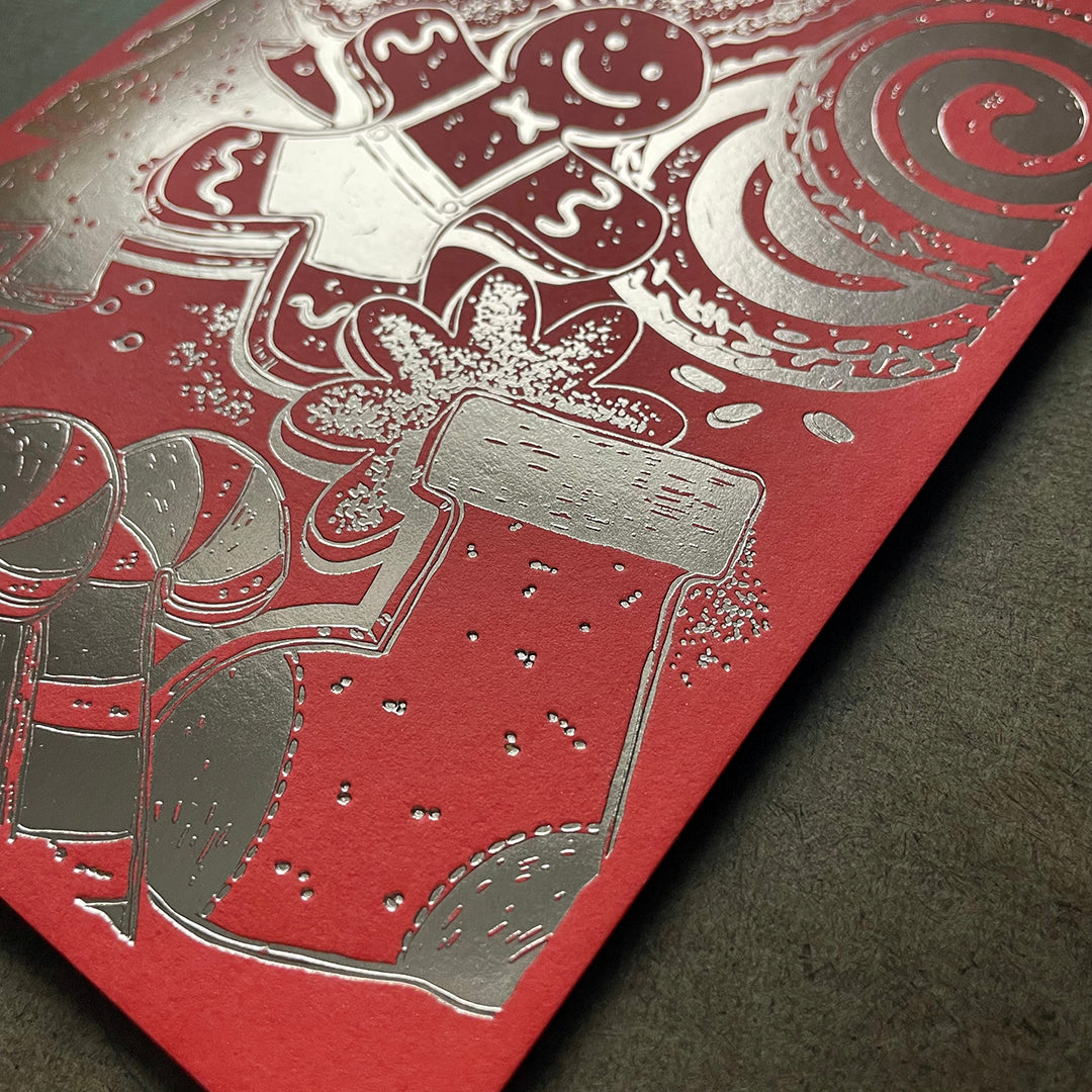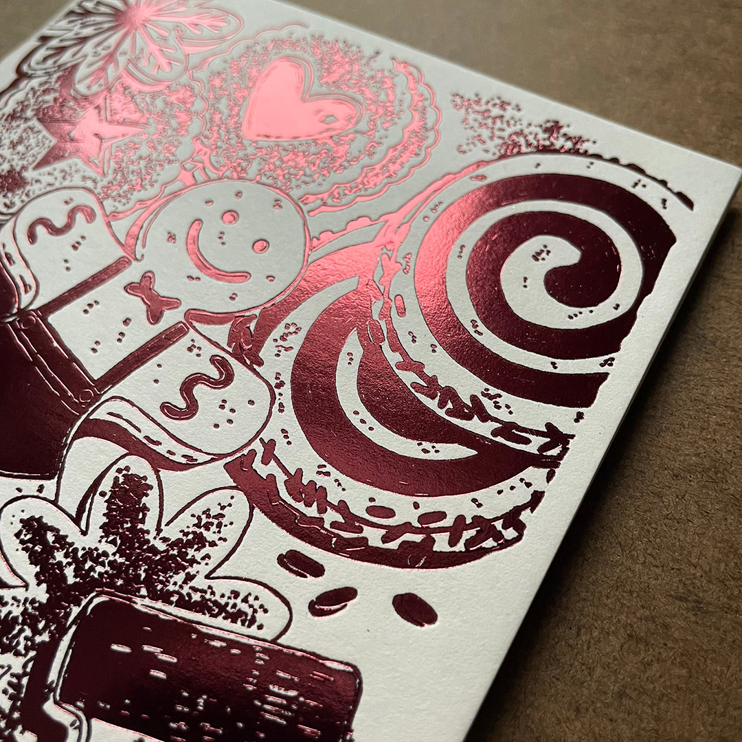 These cards may be the cutest thing we've ever baked! Er... Printed! Cards feature the all your holiday cookie favorites in 3 colors of festive, sparkly foil: Gold on soft white, rose gold on red, and burgundy on biscuit. Paired with kraft envelopes.