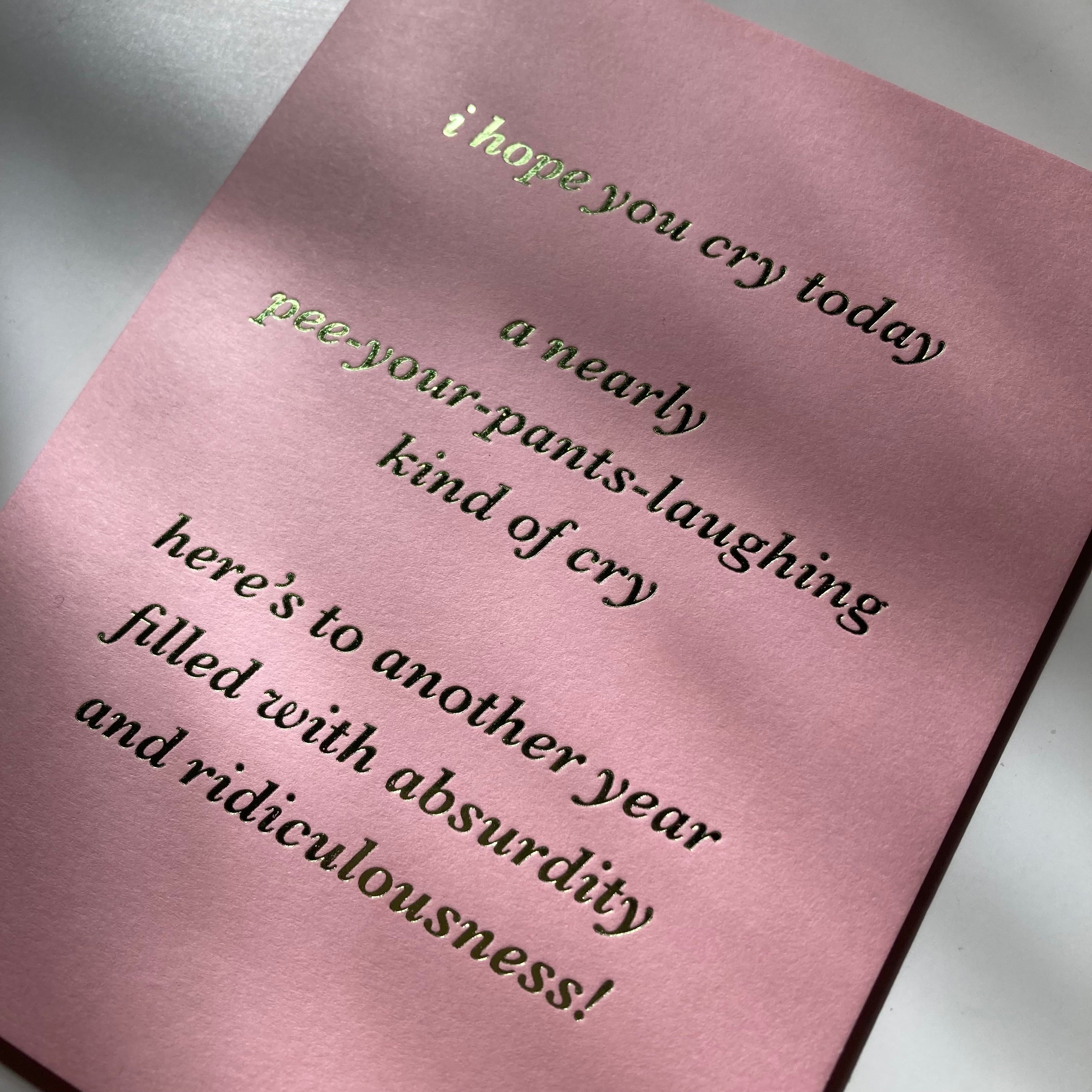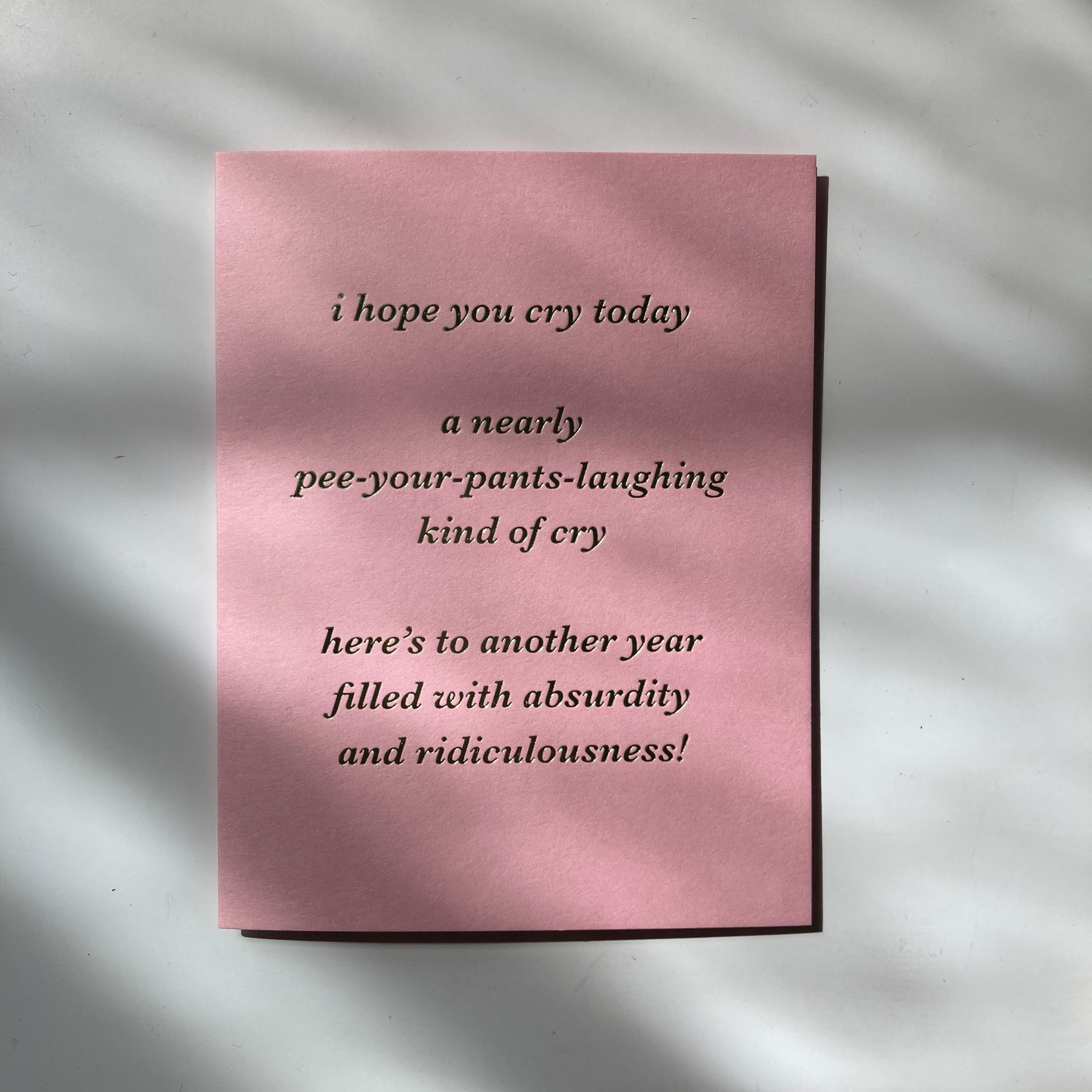 Card reads: "I hope you cry today. A nearly pee-your-pants-laughing kind of cry. Here's to another year filled with absurdity and ridiculousness!"