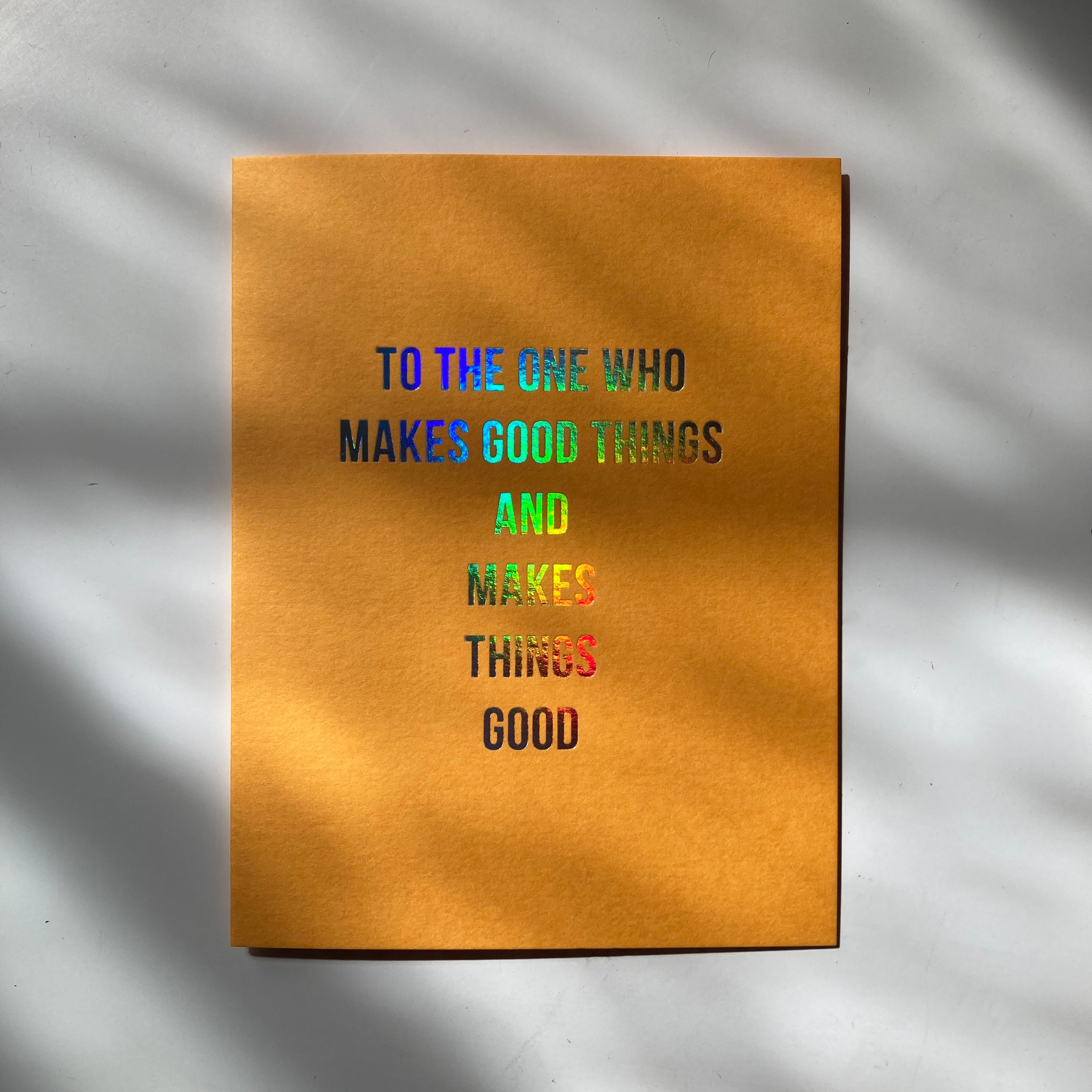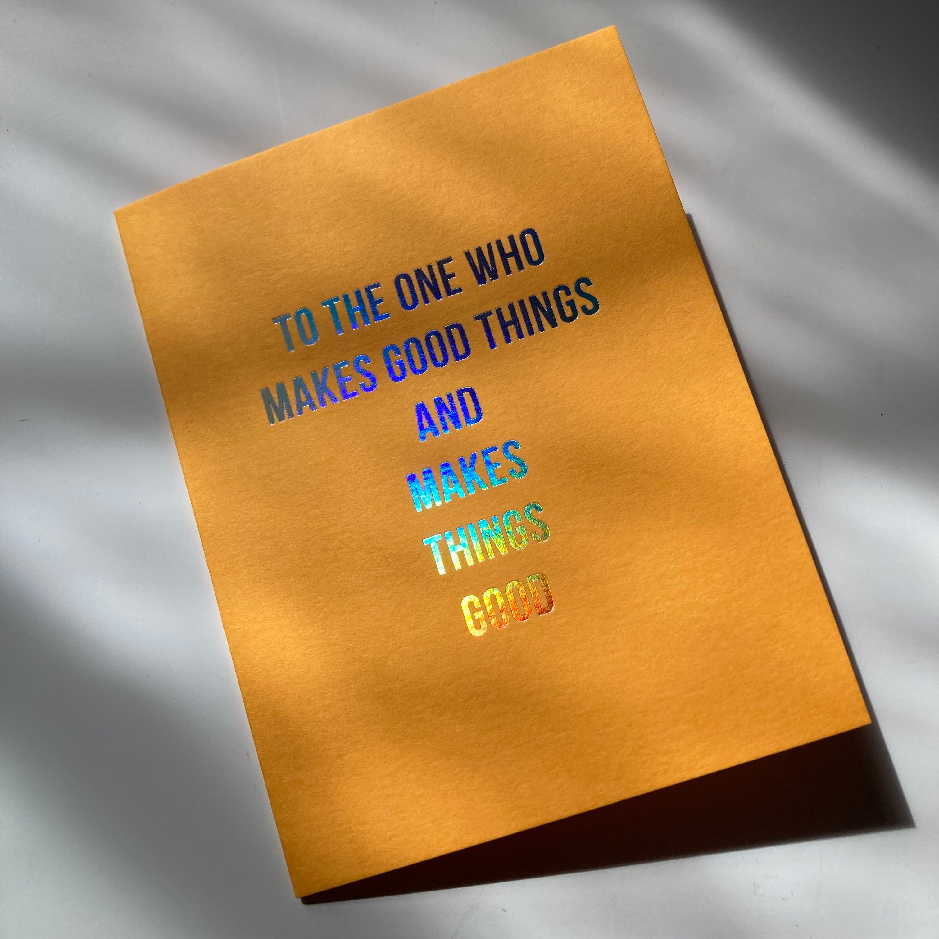 Holographic foil on sunglow orange card | blank inside | 4.25" x 5.5" (folded)