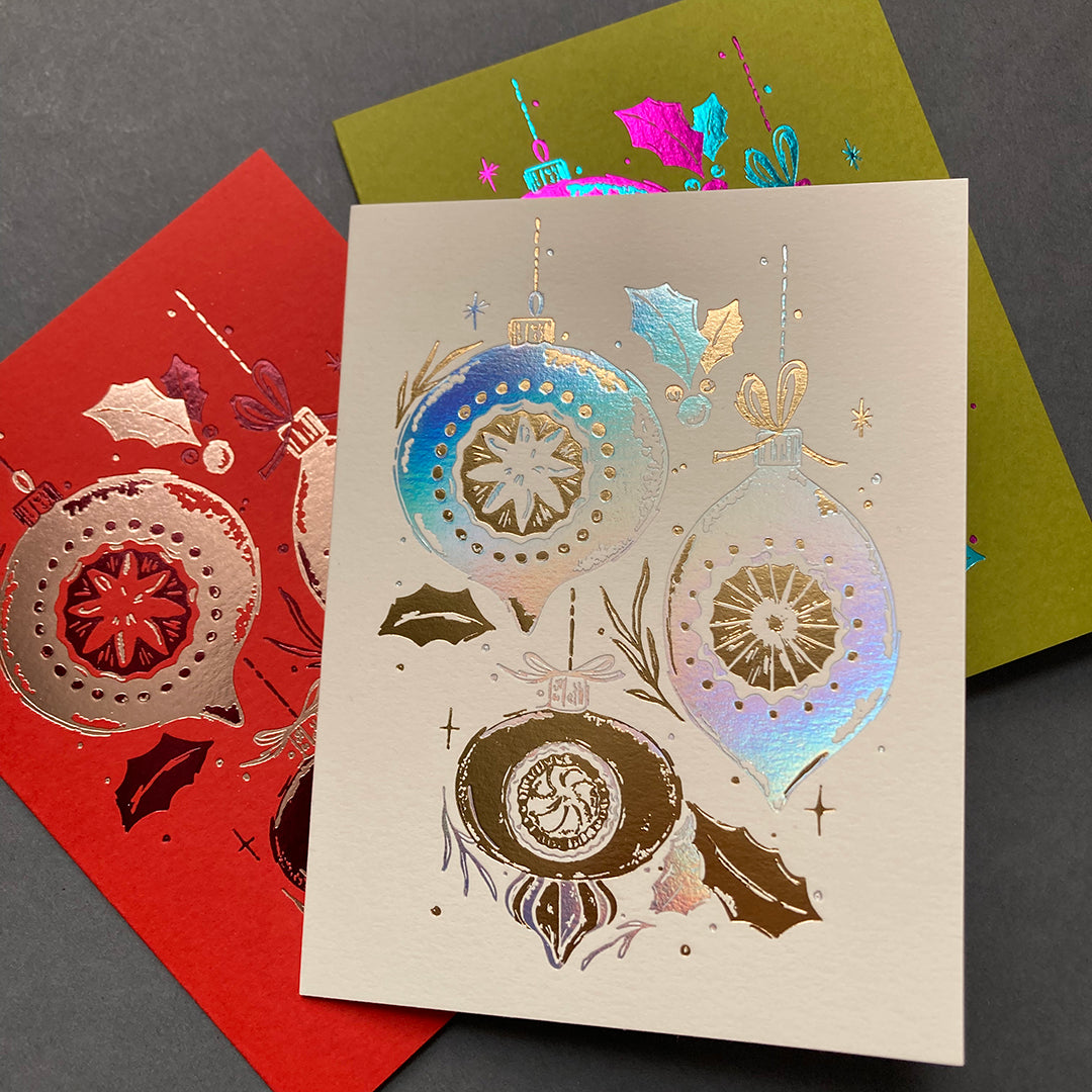 Deck the halls with vintage charm! Cards feature an array of kitschy ornaments shimmering in a variety of funky, retro inspired colors: Burgundy and Rose Gold on Chili Pepper, Antique Gold and Holographic on China White, and Teal and Magenta on Kiwi. Paired with festive kraft envelopes.