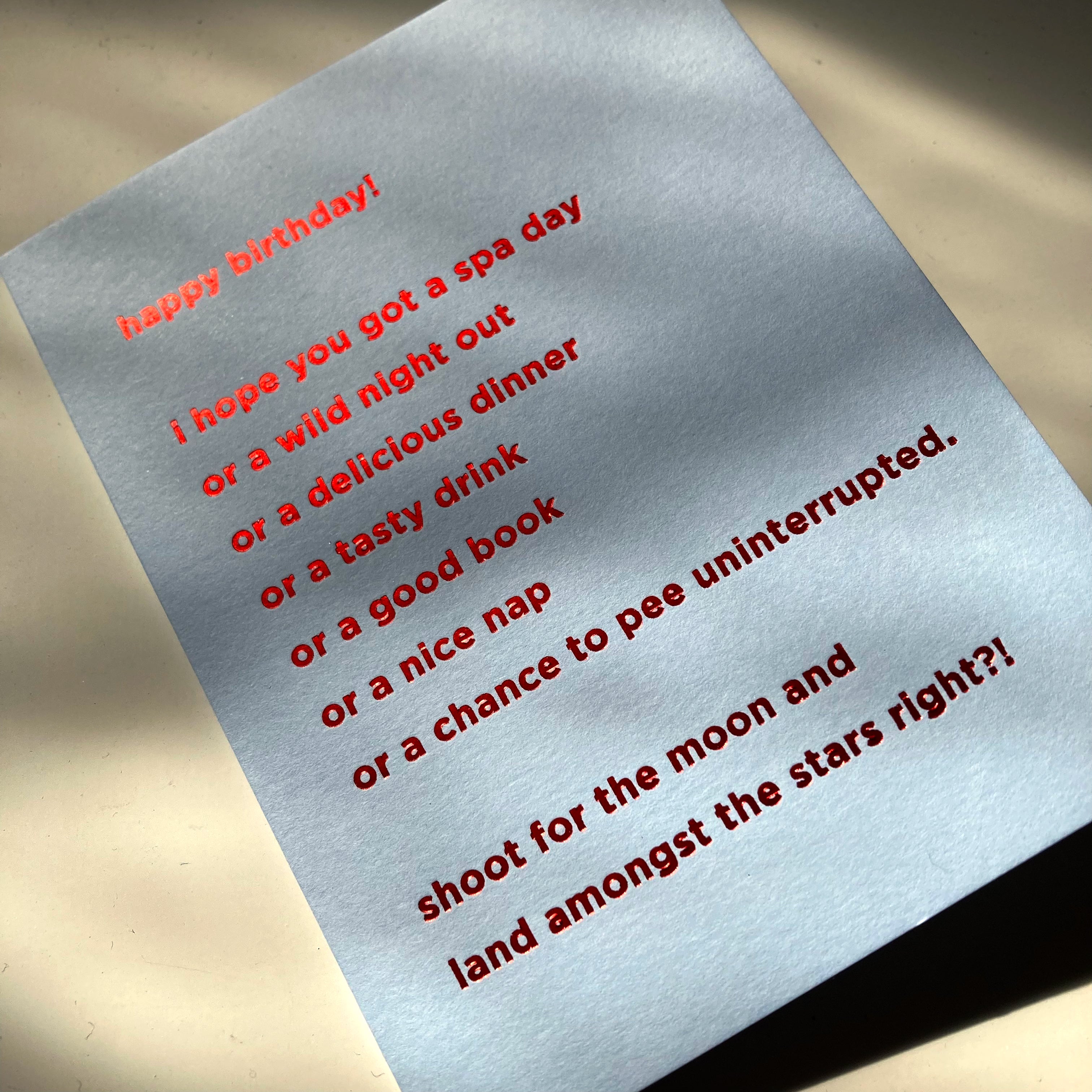 "Happy Birthday! I hope you got a spa day, or a wild night out, or a delicious dinner, or a tasty drink, or a good book, or a nice nap, or a chance to pee uninterrupted. Shoot for the moon and land amongst the stars right?!"
