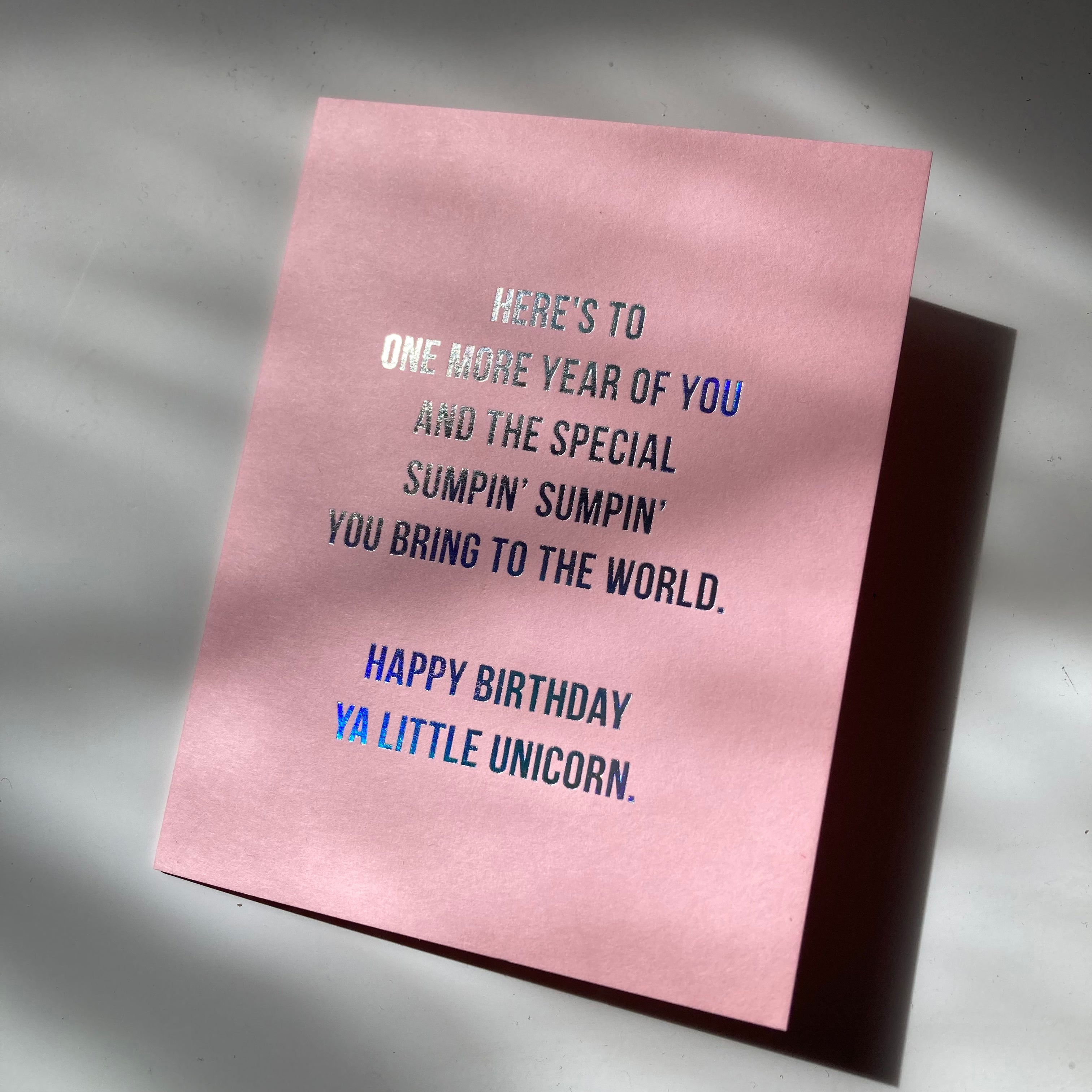 Card reads: "Here's to one more year of you and the special sumpin' sumpin' you bring to the world. Happy Birthday ya little unicorn."